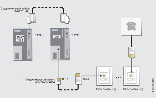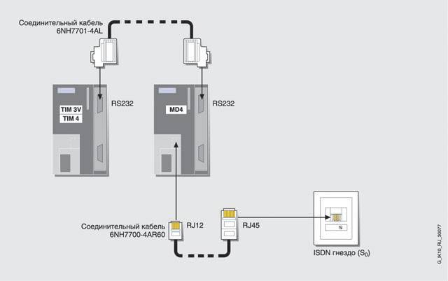 ИнтеграцияISDN модем с автоматическим вызовом абонента На приведенном ниже рисунке показана схема подключения модема MD4 к ISDN сети. Связь с коммуникационным модулем TIM выполнена через последовательный интерфейс RS 232. Подключение к розетке ISDNS0 выполняется соединительным кабелем 6NH7 700-4AR60, который включен в комплект поставки модема MD4. Через коммутируемые розетки S0 параллельно модему MD4 могут подключаться другие модемы, телефонные и другие аппараты. Соединение MD4 с модулем TIM и розеткой ISDN S0 Выделенная ISDN линия: подключение MD4 к модулю TIM через RS 232 Через последовательный интерфейс RS 232 к коммуникационному модулю TIM может подключаться только один модем MD4, поддерживающий соединение “точка к точке”. На приведенном ниже рисунке показано терминальное подключение выделенной ISDN линии. Соединительный кабель 6NH7 700-4AR60 включен в комплект поставки модема MD4. Подключение MD4 к модулю TIM через RS 232, выделенная ISDN линия