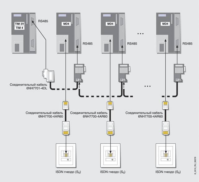 Замечание Выделенная ISDN линия: подключение модемов MD4 к модулю TIM через RS 485 Через последовательный интерфейс RS 485 к одному коммуникационному модулю TIM может быть подключено несколько модемов MD3. Каждый модем поддерживает свое соединение “точка к точке”, образуя лучи звездообразной структуры WAN. Варианты терминальных и промежуточных подключений приведены выше. Соединительный кабель 6NH7 700-4AR60 включен в комплект поставки модема MD4. Подключение нескольких модемов MD4 через RS 485, звездообразное подключение выделенных ISDN линий к одному порту WAN модуля TIM Для подключения модуля TIM к первому модему MD3 используется стандартный соединительный кабель 6NH7 701-4DL. Готовых соединительных кабелей для выполнения соединений между модемами MD3 не выпускается. Для этих целей рекомендуется использовать стандартный кабель 6XV1 830-0EH10 и соединители 6ES7 972-0BA12-0XA0 (см. раздел “PROFIBUS”). | ||||||||||||||||||||||||||||||||||||||||||||||||||||||||||||||||||||||