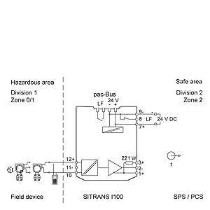 Изолирующий источник питания SITRANS I100 с HART Аналоговый вход 0/4 … 20 мАИзолирующий источник питания используется для искробезопасной работы 2-ух и 3-проводных преобразователей и для соединения с искробезопасными источниками тока.Двух и 3-проводные преобразователи питаются от блока питания передатчика.Для 2-проводных преобразователей изоляторы осуществляют двунаправленную передачу сигнала по HART коммуникациям.