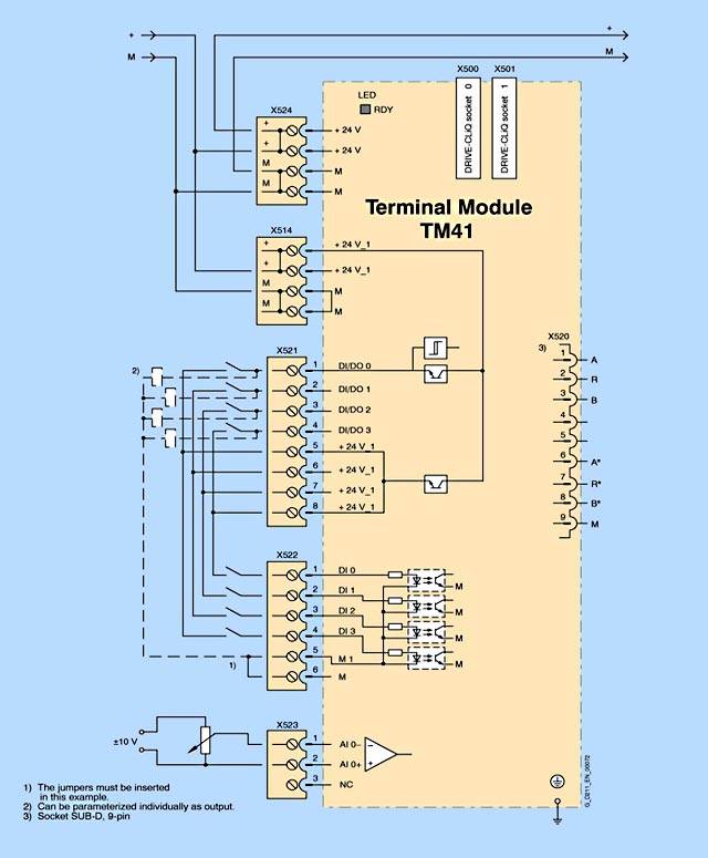 Клеммный модуль TM41 подает сигналы TTL, которые моделируют инкрементальный датчик, то есть осуществляет передачу на более высокий уровень управления. Интерфейс датчика (моделирование инкрементального аналогово-цифрового преобразователя) получает сигнал датчика от Блока управления, например инкрементальный датчик sin/cos путем назначения параметра. Клеммный модуль ТМ41 позволяет увеличить количество цифровых входов/выходов и аналоговых входов приводной системы