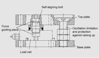 ДизайнКомбинированный монтажный блок состоит из подвижной стойки, головной плиты и плиты основания, а также из двух винтов с потайной головкой, выполняющих роль ограничителей качания и стопоров подъема. Самоцентрирующаяся подвижная опора позволяет головной плите и, соответственно, несущей конструкции следовать горизонтальным отклонениям (например, при колебаниях температуры). Конструкция стойки создает противодействующую силу, которая зависит от величины отклонения и приложенной нагрузки. Ограничение качания предотвращает чрезмерное отклонение и тем самым надежно защищает весоизмерительную ячейку от повреждений. Стопор подъема не дает несущей конструкции подниматься вверх. Весоизмерительная ячейка не входит в объем поставки комбинированного монтажного элемента. Принципиальная схема Конструкция комбинированного монтажного элемента на примере серии RN |