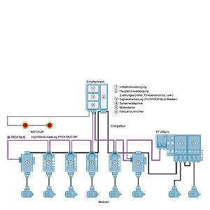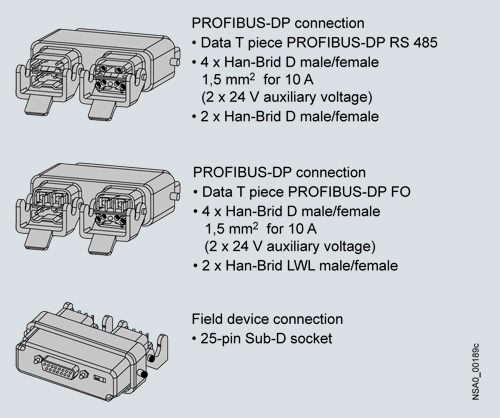 Гибридные соединители применяются как переходиники для передачи данных и питания из шкафа управления (IP 20) в полевую среду (IP65). Активные полевые соединители с функцией повторителя позволяют значительно увеличить длину  PROFIBUS-соединения.