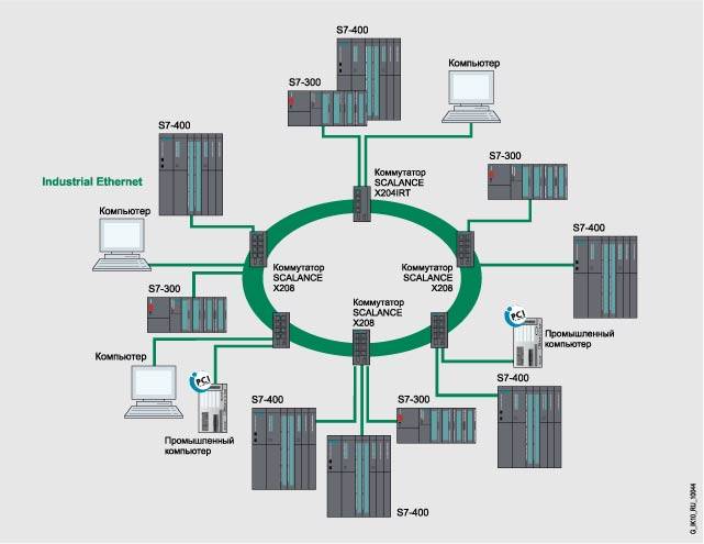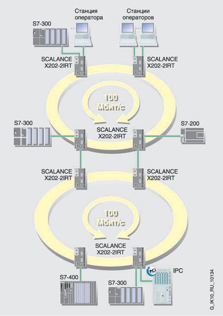 Диагностические PROFINET сигналы тревоги модулей SCALANCE X могут быть отображены соответствующими инструментальными средствами проектирования SIMATIC и обработаны системой управления. Инженерные издержки для программируемых контроллеров, приборов и систем человеко-машинного интерфейса сведены к минимуму за счет полной интеграции в единую концепцию обработки аварийных сообщений SIMATIC. Модули SCALANCE X-200 легко интегрируются в систему управления сетью на основе стандартного протокола SNMP (Simple Network Management Protocol). В случае отказа модули способны формировать аварийные сообщения, передаваемые через сеть (SNMP traps) или по каналам электронной почты по заранее заданным электронным адресам. Встроенный Web сервер позволяет производить установку конфигурационных и диагностических параметром с использованием стандартного Web браузера. Дополнительно с помощью Web браузера может считываться статистическая информация. Пример конфигурации с SCALANCE X204IRT Конфигурация с высокоскоростным резервированием в оптическом кольце Конфигурация с высокоскоростным резервированием в электрическом кольце Резервированное соединение двух подсетей со SCALANCE X-200IRT