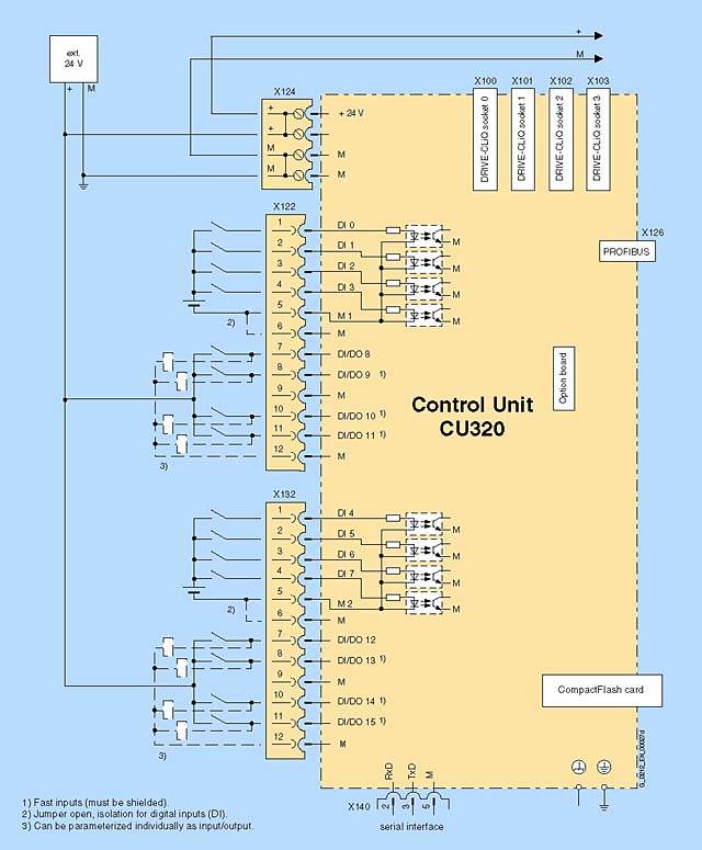 Комплект блока управления, состящий из блока CU320 и программного обеспечения на карте CompactFlash, обеспечивает предопределённые интерфейсы, которые облегчают настройку и наладку. Карта памяти вставляется в CU320 и может быть быстро заменена при обновлении или установке программного обеспечения. Блок CU320 реализует информационный обмен и систему регулирования с или без обратной связи. |