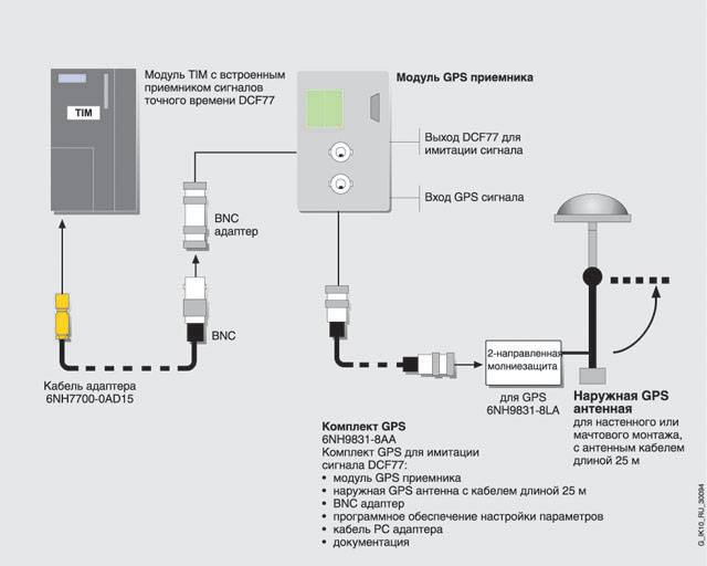 Прием сигналов точного времени DCF77 возможен только в зоне радиусом 800 км вокруг Франкфурта на Майне. В областях, где этот сигнал получить нельзя, для синхронизации времени рекомендуется использовать GPS (Global Positioning System – глобальная система позиционирования) приемник, использующий для этой цели спутниковую связь. В состав системы SINAUT ST7 включен GPS приемник, способный принимать сигналы точного времени и формировать на выходе сигналы DCF77. Последнее обстоятельство позволяет производить подключение выхода GPS приемника к антенному входу приемника сигналов точного времени DCF77 коммуникационного модуля TIM. Комплект поставки GPS приемника включает в свой состав: