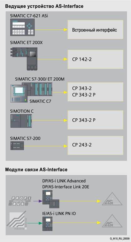 Системные компоненты В составе AS-интерфейса могут использоваться: - Ведущие сетевые устройства в виде коммуникационных процессоров программируемых контроллеров SIMATIC S5/S7 и станций распределенного ввода-вывода SIMATIC ET 200M/X, а также модулей связи DP/ASi.