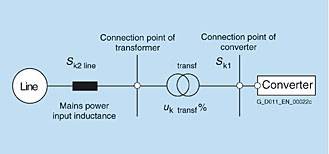 В этом случае мощность короткого замыкания сети Sk1 в точке подключения преобразователя рассчитывается примерно так: S k1 = Stransf / (uk transf + Stransf / Sk2 line )