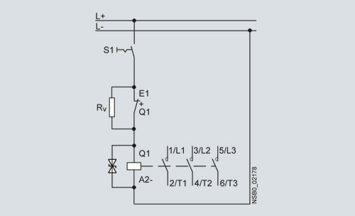 Принципиальная электрическая схема показывает назначение зажимов на каждом контакторе. Один НЗ вспомогательный контакт необходим для функционирования последовательного резистора. Данные для выбора и заказа отображают количество дополнительных незадействованных вспомогательных контактов. Контакторы типоразмера S00 допускают расширение количества вспомогательных контактов.