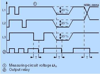 ФункцииРеле 3UG30 13 контролирует последовательность фаз, выпадение одной фазы и снижение заданного измеряемого напряжения на 20 %. При правильной последовательности фаз и соответствии контролируемого напряжения значению заданного измеряемого напряжения выходные реле притягивают и горят светодиоды индикации рабочего напряжения и состояния реле. При выпадении фазы реле отпускается (при выпадении L3 сразу после устанавливаемого на передней панели времени Т) и светодиод индикации состояния реле гаснет. Если контролируемое напряжение падает симметрично (одновременно L1, L2 и L3) или асимметрично (только одна фаза) более чем на 20 % от задаваемого измеряемого напряжения, то выходное реле срабатывает после установленного времени Т и соответствующий светодиод гаснет. Если контролируемое напряжение превышает гистерезис на величину от 2 до 10 % от заданного измеряемого напряжения, выходные реле снова притягивают и загорается светодиод.