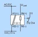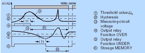 Функция сохранения/без сохранения устанавливается на реле 3UG35 31/3UG35 32/3UG35 34 DIP-переключателем в основании аппарата. Аппарат 3UG35 34 имеет собственное питание, то есть на нижеприведенной диаграмме А1/А2 замещается измеряемым напряжением. Достоинства изделий с внешним питанием