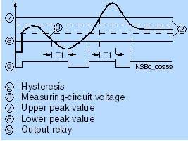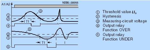 Реле 3UG35 35, с собственым питанием и контролем окнаРеле 3UG35 35 контролирует приложенное напряжение в заданных пределах (окне). Задаются и контролируются верхнее и нижнее пороговое значения. Как только напряжение выходит за пределы установленного диапазона, выходное реле отпадает по истечении заданного времени Т1. Указания по проектированию: Если верхнее и нижнее пороговые значения находятся близко друг к другу, то вследствие отклонений в точности настройки и в обоих гистерезисах могут возникнуть неопределенные коммутационные состояния.