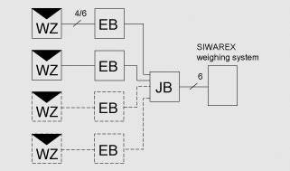 Расширительная коробка EB служит для удлинения кабелей, с помощью которых подключаются ячейки. Весоизмерительные ячейки подключаются по 4- или 6-проводной технологии. Кабельное соединение с весоизмерительным модулем или распределительной коробкой JB всегда выполняется по 6-проводной технологии. В качестве кабеля рекомендуется использовать SIWAREX 7MH4 702-8AG или -8AF. Если кабель от весоизмерительной ячейки идет в распределительную коробку JB, соединения типа M16 x 1,5 в коробке следует заменить. Для каждой весоизмерительной ячейки требуется: - 1 кабельное ЭМС-соединение M20 x 1,5