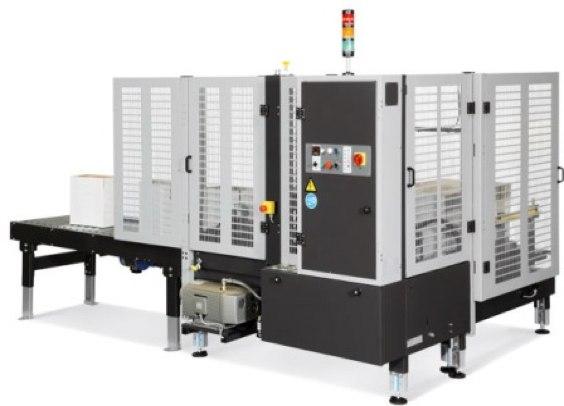 Машина оснащена магазином для встановлення до 150 коробів. Розгортає їх автоматично, закриває нижні пелюстки і приклеює їх самоклеючою стрічкою (скотчем).