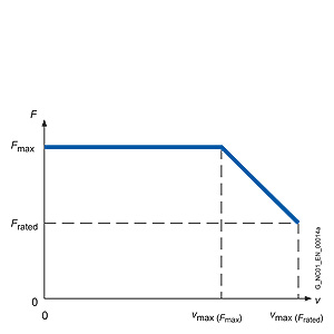 Линейные двигатели 1FN3 имеют диапазон перегрузки, необходимый для процессов ускорения. Максимальное усилие FMAX возможно только до максимальной скорости vMAX(FMAX); до скорости vMAX(Frated), только номинальное усилие подачи Frated возможно.
