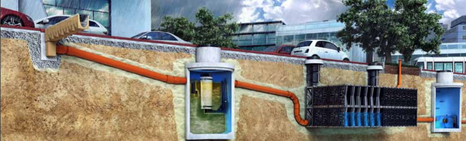 Накопительные резервуары могут быть использованы в разных частях комплекса по управлению поверхностным стоком.