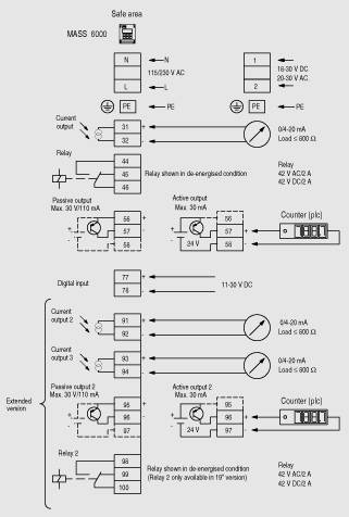 Схема подключенияЭлектрическое соединение Заземление PE требуется из-за питания класса защиты 1. Механические счётчики Если к соединениям 57 и 58 подключается механический счетчик (активный выход), то необходимо подключить конденсатор 1000 µF к соединениям 56 и 58, плюсовой полюс к соединению 56 и минусовой полюс к соединению 58. Выходной кабель В окружении с электрическими помехами рекомендуется использовать экранированный кабель Электрическое соединение Преобразователь сигналов MASS 6000 и преобразователь расхода MASS MC1 Ex application Transmitter MASS 6000 and sensor MASS MC1 Ex approved MASS 6000 and MASS MC1 in Ex application: „e“ certified products (increased safety) to a certain voltage level can be connected to equipment in the safe area which are designed to guarantee no higher voltage than specified on the „e“ certified equipment. For the MASS 6000 / MC1 this means: All secondary circuits/terminals can be considered as limited circuits with non-hazardous voltage of max. 60 V. The MC1 sensor certified as „e“ up to 60 V. This means that the MASS 6000 and MC1 can be connected with no further approvals. Equipment connected to the signal outputs (current, pulse etc) must however obtain the same high degree of isolation from mains supply as the MASS 6000 (Class 2 transformer or Class 1). |