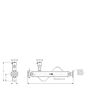 Наилучшей является вертикальная позиция установки с направлением протока снизу вверх (см. рисунок). Преимуществом этого является то, что при скорости расхода ноль содержащиеся в жидкости твердые примести осаждаются вниз, а пузырьки газа из измерительной трубки поднимаются вверх. Кроме этого возможно простое опорожнение измерительной трубы. Это предотвращает отложения.