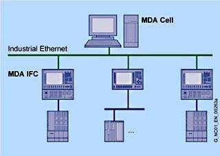 С помощью Interface−ClientMDAIFCSINUMERIK 840Di sl/840D slили OPC−совместимая система (например, SIMATICS7) подключается к MDACell (или к расширенному решению MDAPlant). Интерфейс обеспечивает надежную передачу и промежуточную буферизацию при отключениях сетевого соединения. | |||||||||||||||