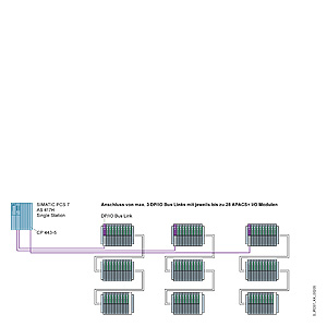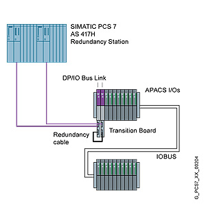 PCS 7 APACS+ DP/IO bus link поддерживает резервированную (децентрализованную) и нерезервированную конфигурацию. AS 417H (одиночная станция/резервированная) с APACS+ I/O модулями PCS 7 APACS+ DP/IO bus link, может быть также расширена по PROFIBUS DP, с помощью станций удаленного ввода/вывода ET 200M.