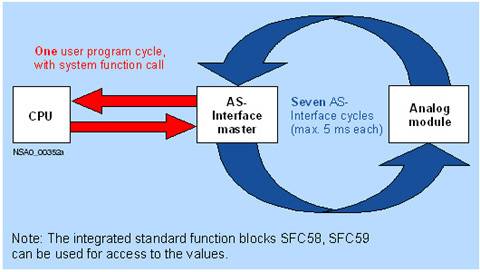 Функции Для обмена данными между ведущим устройством AS-Interface и аналоговым модулем профиля 7.1/7.2 требуется 7 полных циклов шины AS-Interface. Подобный обмен данными возможен только с ведущими устрой-ствами AS-Interface спецификации V2.1. В случае опроса модуля ввода аналоговых сигналов результат аналого-цифрового преобразования накапливается в ведущем устройстве. Формирование окончательного значения измеренной аналоговой величины выполняет ведущее устройство AS-Interface. Программа пользователя получает результат аналого-цифрового преобразования в виде готовой величины после формирования очередного запроса к ведущему устройству AS-Interface. Передача этого значения выполняется очень быстро. Обслуживание аналоговых выходов производится в обратном порядке. Требуемое значение аналоговой величины загружается из контроллера в ведущее устройство AS-Interface после чего передается в аналоговый модуль за 7 циклов шины AS-Interface. |