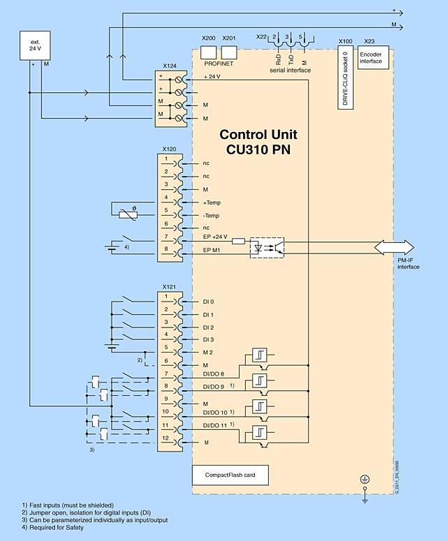 ИнтеграцияБлок контроля CU310 PN использует модули питания в блоковом формате с использованием PM IF-интерфейса. В этом случае другие компоненты DRIVE-CLiQ, такие как модули датчиков или терминалов могут быть подключены к сокету DRIVE-CLiQ на блоке управления CU310 PN. Модули питания в формате для подключения к шасси управляются блоком управления CU310 DP с использованием DRIVE-CLiQ интерфейса. С этим параметром модули датчиков и терминалов должны быть подключены к свободным сокетам DRIVE на блоке питания. Настройки параметров можно изменить, используя базовую панель оператора BOP20, Панель BOP20 также может быть подключена к блоку управления CU310 PN в рабочем процессе для выполнения процедур диагностики. Блок управления CU310 PN и другие подключенные компоненты вводятся в эксплуатацию и диагностируются с помощью средства STARTER. Блок управления CU310 PN взаимодействует с системами правления более высокого уровня с помощью PROFINET и профиля IO PROFIdrive. Интегрированные функции безопасности, такие как "Защитный механизм отключения привода“ (= "Безопасное отключение“) должны быть разделены на два канала. Два цифровых входа на блоке управления CU310 PN необходимы для выполнения этой задачи. Внешний источник 24 В может быть подключен к CU310 для обеспечения питания если входящие источник модуля питания не подключен