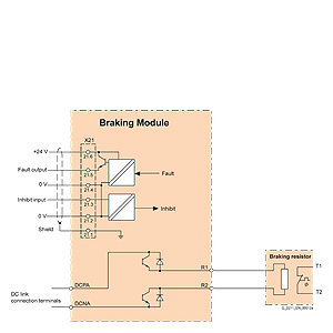 Модуль торможения и соответствующий внешний тормозной резистор необходимы возможности для целенаправленной остановки приводов при отказе питания (к примеру, аварийный отвод или АВАРИЙНЫЙ ОСТАНОВ категория 1) или для ограничения напряжения промежуточного контура при кратковременном генераторном режиме. Модуль торможения содержит силовую электронику и соответствующую схему управления. При работе энергия промежуточного контура преобразуется в потери тепла во внешнем тормозном резисторе. Модуль торможения работает автономно.