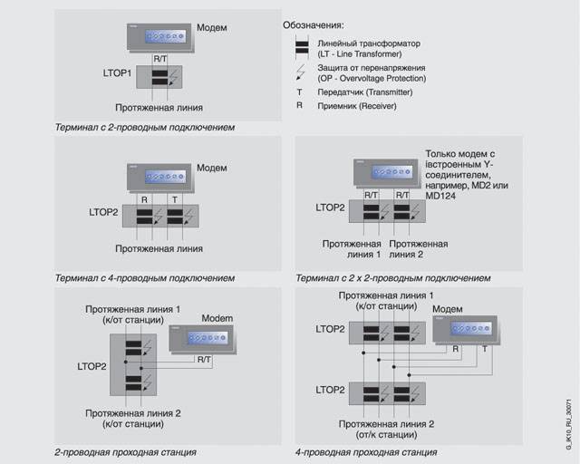 с двумя разделительными трансформаторами, предназначенный для установки в начале и в конце 4-проводной выделенной линии связи. Кроме того, модуль может использоваться в качестве проходного устройства для 2-проводных выделенных каналов связи. Для построения проходных устройств 4-проводных выделенных каналов связи необходимо использовать два модуля LTOP 2. Модули LTOP оснащены контактами под винт и гнездом RJ12 Western. Подключение модулей LTOP к модемам MD2 и MD3 (при работе на выделенную линию) выполняется соединительным кабелем (RJ12-RJ12), входящим в комплект поставки указанных модемов. |