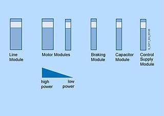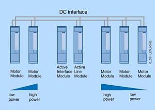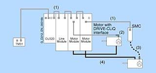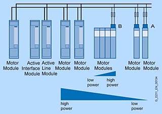 КонфигурацияКомпоненты системы подключения Для завершения системы привода, к ней при помощи кабелей должны быть подключены такие компоненты, как двигатели и преобразователи. На двигателях с интерфейсом DRIVE CLiQ подача питания 24 В DC осуществляется через кабели DRIVE CLiQ. На всех других Сенсорных Модулях должен присутствовать отдельный источник питания 24 В DC. Система подключений привода | Обозначение | Кабель | Описание | | (1) | Кабели DRIVE CLiQ | Стандартные кабели для конфигурации внутри шкафа без 24 В сердцевин | | (2) | Кабели DRIVE CLiQ MOTION CONNECT 500/800 | Кабели MOTION CONNECT 500 с защитой с 24 В сердцевинами для фиксированной установки (например, в кабельном канале), и MOTION CONNECT 800 для гибкой установки (например, в носителях кабеля) | | (3) | Сигнальные кабели MOTION CONNECT 500/800 | Подходит для данной системы измерения; в версиях MOTION-CONNECT 500 для фиксированной установки (например, в кабельном канале), и MOTION CONNECT 800 для гибкой установки (например, в носителях кабеля) | | (4) | Силовые кабели MOTION CONNECT 500/800 | Кабели MOTION CONNECT 500 с защитой для фиксированной установки (например, в кабельном канале), и MOTION CONNECT 800 для гибкой установки (например, в носителях кабеля) | Кабели DRIVE CLiQ доступны в различных форматах и длинах (смотрите систему подключения). Требуемые радиусы преломления относятся только к коротким кабелям. В дополнение к расстоянию между двумя гнёздами DRIVE CLiQ, соединяемых кабелем, для радиусов преломления должна быть обеспечена длина кабеля в 60 мм (2,36 дюйма). Неиспользованные гнёзда DRIVE CLiQ могут быть защищены при помощи заглушки. Подходящие заглушки можно приобрести, например, у YAMAICHI, Заказной номер: Y ConAS 13, http://www.yamaichi.de/ Конфигурация приводов Многоосевой привод SINAMICS S 120 состоит из Модуля Линии, Модулей Двигателя, компонентов цепи DC, Блока Управления и вспомогательных модулей расширения. Конфигурирование привода формата книги При настройке конфигурации привода формата книги должны учитываться следующие условия: • Модуль Линии всегда должен находиться слева первым модулем. • На каждом приводе может быть установлен только один Модуль Линии. • Несколько приводов должны быть настроены на использование источников питания, которые не могут обеспечиваться номинальной мощностью. • Модули Двигателя должны находиться рядом с Модулем Линии в ниспадающем порядке номинального тока слева направо (наивысший номинальный ток слева, низший номинальный ток справа). Из-за повышенный токов Модули Двигателя с креплениями шириной 200 мм (7,67 дюйма) и 300 мм (11,81 дюйма) имеют шины цепи DC с увеличенной площадью сечения. Внутри привода все шины цепи DC должны отвечать требованиям по пропускной способности по току для всех Модулей Двигателя. • Для создания многоуровневых конфигураций могут использоваться адаптеры сети DC. • Приводы должны настраиваться таким образом, чтобы общая длина всех силовых кабелей для кабелей двигателя и линейные кабели в каждой отдельной группе, которые желательно должны быть с защитой), была ≤ 350 м (1149 фт.). Для кабелей длиной от 350 м (1149 фт.) до 630 м (2067 фт.) должен быть установлен Модуль Фиксации Напряжения. • Шины сети DC могут подключаться справа и слева с Активными Модулями Линии мощностью 55 кВт, 80 кВт и 120 кВт. В данном случае привод может настраиваться в обратном порядке (справа налево) или на обеих сторонах (смотрите схемы подключения блоков формата шасси). • Модуль Торможения, как пр