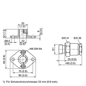Упорный фланец по DIN 43734 (слева) и резьбовая муфта (справа) для монтажа прямых термопар, размеры в мм (дюймах)