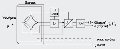 The output voltage of the sensor is applied to the electronic circuit where it is converted into an output current of 4 to 20 mA.