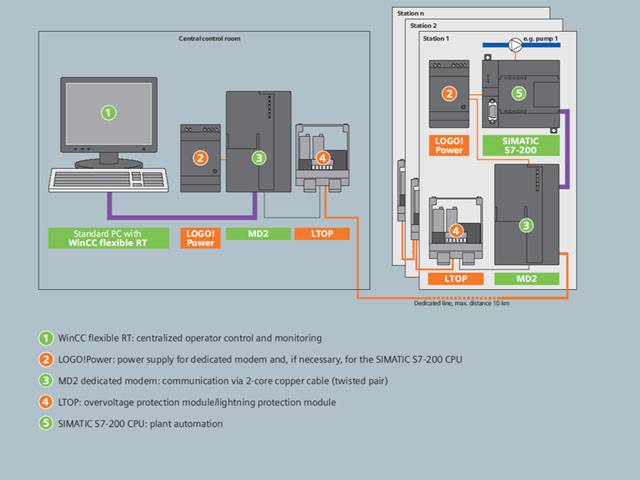 Удаленное управление и контроль по модемной линии связиПростое управление удаленно-установленным SIMATIC S7-200, модем выделенной линии MD2 и WinCC flexible RT