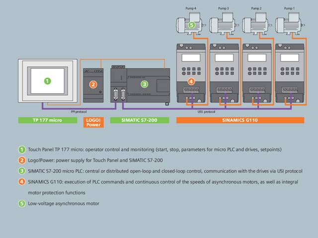 Простое соединение в сеть и каскадирование двигателейНепрерывное регулирование мощности двигателя с SIMATIC S7-200, 4 x SINAMICS G110 и TP 177micro