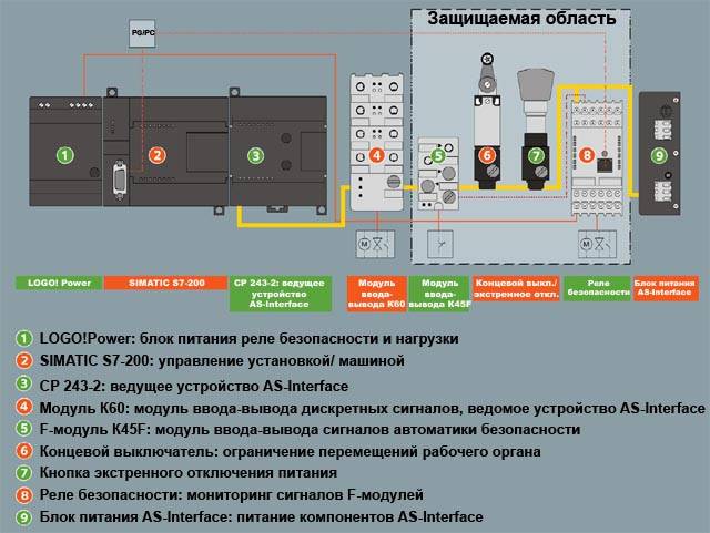 Безопасное переключение при помощи Монитора безопасности AS-Interface и вычисления в SIMATIC S7-200 через Мастер AS-Interface. - Чрезвычайная безопасность – Монитор Безопасности позволяет получить низкостоимостное безопасное переключение с возможностью использовать микро ПЛЦ S7-200 подключенного к шине AS-Intereface. Это означает, что приводы и датчики полевого уровня могут быть легко объединены в сеть идеальной формы и также просто могут быть отключены в критической или опасной ситуации.