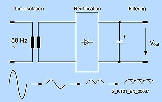 Входное напряжение переменного тока частотой 50 или 60 Гц понижается до требуемого уровня трансформатором и преобразуется в постоянный ток с помощью выпрямитеяя, оснащенного сглаживающим фильтром.