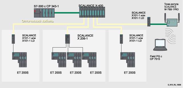 Звездообразная топология сети с конверторами SCALANCE X101-1/X101-1LD и удаленных точек доступа SCALANCE W Линейная топология сети с конвертором SCALANCE X101-1, электрическими и оптическими каналами связи Электрическое кольцо с оптической вставкой, выполненной через конверторы SCALANCE X101-1 или SCALANCE X101-1LD Оптическое кольцо с конверторами SCALANCE X101-1LD Резервированное соединение двух колец с использованием конвертора SCALANCE X101-1 или SCALANCE X101-1LD Диагностика Диагностические светодиоды контроля: - Наличия питания.