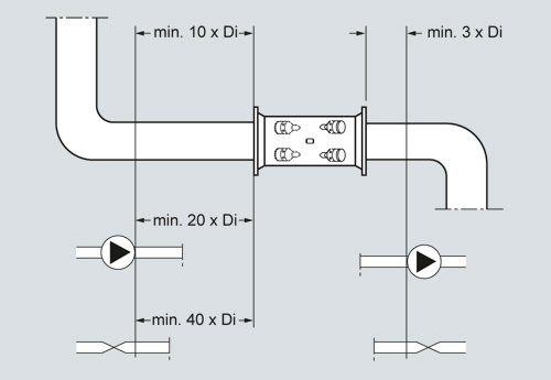 При установке расходомера прямые участки трубы должны составлять 10 x Di до расходомера (Di = диаметр расходомера) и 3 x Di после.