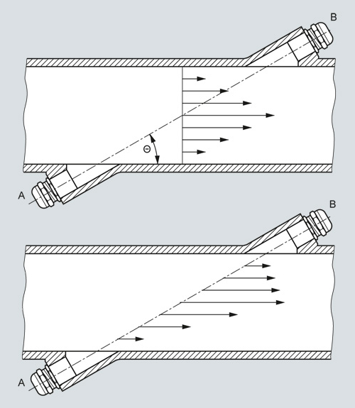 В расходомерах SITRANS F US SONOFLO оба ультрозвуковых акустических преобразователя располагаются под услом по отношению к оси трубы.Акустические преобразователи работают как измерительные преобразователи и приёмники ультразвуковых сигналов. Для измерения определяется время, которое ультразвуковой сигнал затрачивает при перемещении по и против потока. Принцип может быть выражен следующим образом: