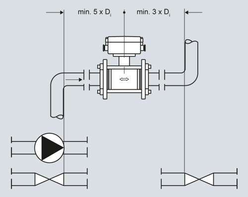 Для достижения макс. точ ости при измерении расхода необходимы прямые впускные и выпускные трубы, а также соблюдение определенного интервала между расходомером и насосами или вентилями.