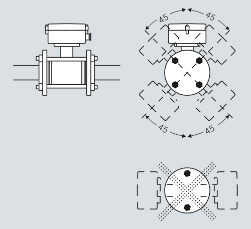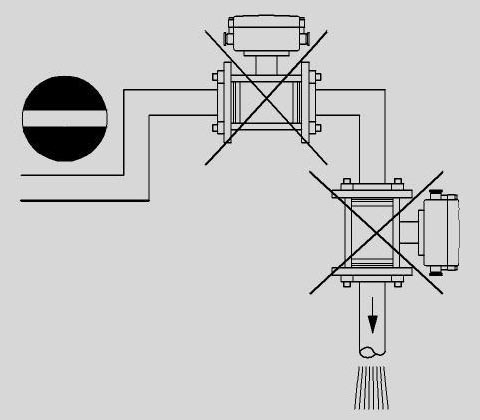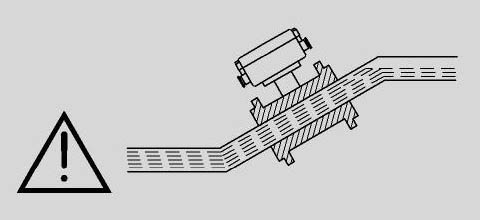 Измерительный датчик должен быть смонтирован согласно рисунку выше. Запрещено монтировать измерительный датчиктак , как это показано на рисунке ниже, т.к. в результате электроды располагались бы сверху, где возможны пузырьки воздуха, или снизу, где могут скапливаться отложения, песок и т.п.