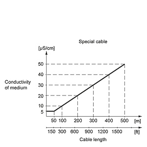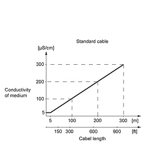 Для определения пустого измерительного датчика проводимость среды всегда должна быть ≥20 µS/c, а макс. длина кабеляэлектродов при раздельном монтаже всегда должна составлять не более 50 м (150 ft). Обязательным является использованиеспецкабеля.