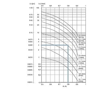 Пример:Скорость протока (v) в 3 м / (10 ft/s) в измерительном датчике с уменьшением диаметра с DN 100 (4") на DN 80 (3") (d 1 /d 2 =0,8)приводит к падению давления в 2,9 мбар.
