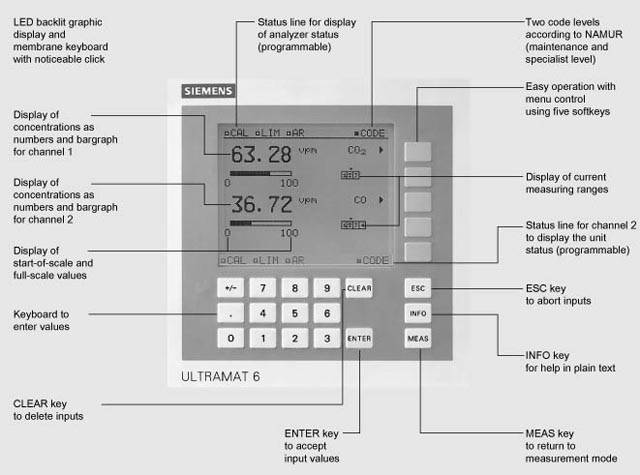 The ULTRAMAT 6 single-channel or dual-channel gas analyzers operate according to the NDIR two-beam alternating light principle and measure gases highly selectively whose absorption bands lie in the infrared wavelength range from 2 to 9 μm, such as CO, CO2, NO, SO2, NH3, H2O as well as CH4 and other hydrocarbons. Single-channel analyzers measure up to 2 gas components, dual-channel analyzers up to 4 gas components simultaneously.