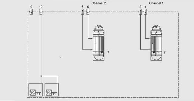 Gas path ULTRAMAT 6, single-channel unit, 19“ unit, with flow-type reference cell (option) Gas path ULTRAMAT 6, dual-channel unit, 19“ unit Gas path (field unit)