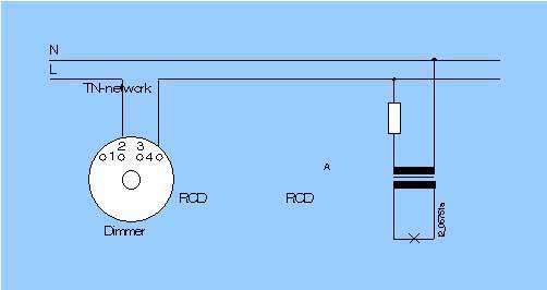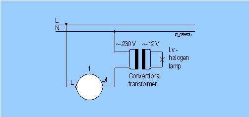 Поворотный диммер для схем отключения света из одной или двух точек 15-500 Вт, 50 Гц, 230 V переменного тока, низковольтные галогеновые лампы с обычным трансформатором, отсечка фазы по переднему фронтуДля защиты трансформаторов рекомендуется использовать слаботочный предохранитель (соответственно мощности трансформатора)