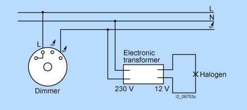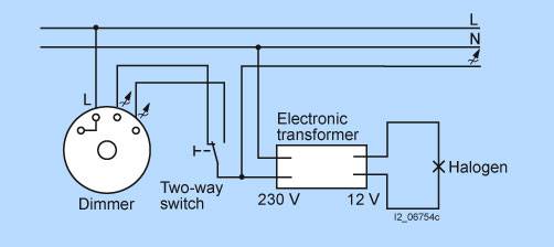 Поаоротьный диммер для схем отключения света из одной или двух точек 10-350 Вт, 50 Гц, 230 V переменного тока, низковольтные галогеновые лампы для электронных трансформаторов, отсечка фазы по заднему фронтуМожно использовать все диммеры с кнопкой вкл/откл и схемой кнопочного вкл/откл света из двух точек