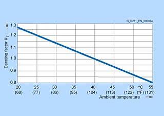 Пример 1 Система привода, включающая в себя сетевые модули и модули двигателя должна работать на высоте 2500 м (8204 футов) над уровнем моря при максимальной окружающей температуре 30 °C (86 °F). Т.к. окружающая температура ниже 40 °C (104 °F), необходимо выполнить компенсирующее вычисление (высота установки над уровнем моря/окружающая температура). Причина: Высота установки над уровнем моря: 2500 м (8204 футов) (корректирующий коэффициент kI = 0.965, kU = 0.94) Макс. окружающая температура: 30 °C (86 °F) (корректирующий коэффициент kT = 1.133) Используется следующая формула: I ≤ IUN × kI × kT I = допустимый непрерывный ток I UN = номинальный ток I ≤ IUN × 0.965 × 1.133 I ≤ IUN × 1.094 Результат: Не нужно уменьшать ток, т.к. в результате получается коэффициент > 1. Но необходимо уменьшить напряжение в соответствии с IEC 60664-1. Пример 2 Когда конфигурируется группа приводов, выбирается модуль двигателя с заказным номером 6SL3320-1TE32-1AA0. Группа приводов будет работать на высоте 3000 м (9845 футов) над уровнем моря, где окружающая температура может достигать 35 °C (95 °F). Высота установки над уровнем моря: 3000 м (9845 футов) (корректирующий коэффициент kI = 0.925, kU = 0.88) Макс. окружающая температура: 35 °C (95 °F) (корректирующий коэффициент kT = 1.066) Модуль двигателя: выходное напряжение от 380 В дo 480 В, 110 кВт, 210 A Используется следующая формула: I ≤ IUN × kI × kT I = допустимый непрерывный ток I UN = номинальный ток I ≤ IUN × 0.925 × 1.066 I ≤ IUN × 0.987 Результат: Ток необходимо уменьшить, т.к. получился коэффициент < 1. Максимальный непрерывный ток модуля двигателя 210 A × 0.987 = 207 A. Необходимо уменьшить напряжение в соответствии с IEC 60664-1. | ||||||||||||||||||||||||||||||||||||||||||||||||||||||||||||||||||||||||||||||||||||||||||||||||||||||