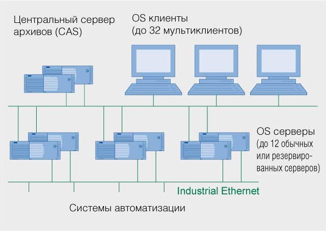 SIMATIC PCS 7 поддерживает до 12 ОС-серверов или резервированных пар ОС-серверов в многопользовательской архитектуре. ОС-клиенты в мультиклиентском режиме могут одновременно обращаться к данным 12 ОС-серверов/резервированных пар ОС-серверов (до 32 ОС-клиентов одновременно к 1 ОС-серверу/резервированной паре).