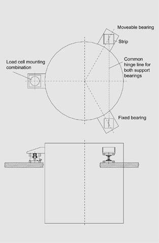 Ковшовые весы с двумя изгибными опорами и одной весоизмерительной ячейкой В весах, к точности которых предъявляются умеренные требования (например, взвешивание с целью выяснения уровня заполнения), при трехточечной опорной системе можно использовать вместо трех весоизмерительных ячеек одну ячейку и две изгибных опоры, вместо трех ячеек. При четырехточечной опорной системе для определения уровня заполнения используются две весоизмерительных ячейки и две изгибный опоры. Конструкция на базе изгибных опор - самое экономичное решение, которое способно гасить горизонтальные силы на уровне опор. Это позволяет исключить дополнительную привязку. Если интенсивные горизонтальные силы возникают вне уровня опор (например, энергия ветра), необходимо принять соответствующие меры. Весы, оснащенные изгибными опорами, могут обеспечить точность от 1% до 2%, если выполнены следующие условия: