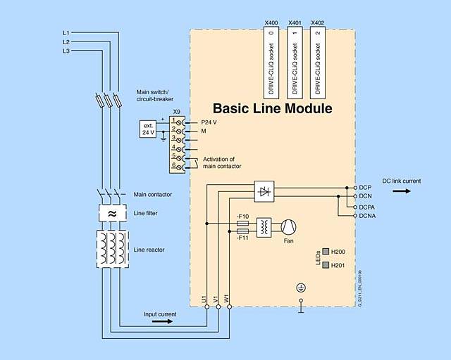 Базовый линейный модуль преобразует источник перем. тока в неконтролируемый источник пост. тока. Базовые линейные модули используются для приложений, в которых отсутствует возврат энергии к источнику или в которых происходит обмен энергией между осями двигателя и генератора в вставке постоянного тока. Подключенные модули двигателя заранее заряжаются с использованием тиристорного селекторного, обеспечивающего напряжение пост. тока соответствующее 1,35 x напряжение в сети. Базовые линейные модули можно использовать для подключения к системам с заземленной нейтралью (TN, TT) и системам без заземления (IT) |