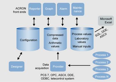 ACRON - это продукт для системной оптимизации, долговременного архивирования и сбора данных. Первоначально был разработан в соответствии с требованиями поддержки окружающей среды, но хорошо зарекоммендовал себя при использовании в различных секторах индустрии в течение более 10 лет. ACRON также соответствует высоким требованиям, предъявляемым в сфере водоочистки/утилизации (напр., ATV M260 в Германии). ACRON 6, текущая версия, предлагает исключительное соотношение цена/производительность, и поражает своей пригодностью, надежностью и целостностью данных. Простое конфигурирование и управление, высокая гибкость также присущи этой системе. Интерфейс ACRON 6 соответствует требованиям системы управления SIMATIC PCS 7. Определенные модули могут встраиваться в качестве OCX объектов в SIMATIC PCS 7. ACRON 6 доступен в настоящий момент с поддержкой ангдийского, немецкого и итальянского языков. |